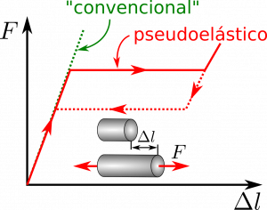 Consider, for example, what happens when a deformation \(\Delta l\) is imposed on any (one-dimensional) body. As the applied deformation increases, so does the force $F$ required to sustain it. In a typical engineering material, this relationship is linear and limited by its plastic deformation. Shape memory materials exhibit a special behavior: once a certain level of deformation (or applied load) is reached, the deformation can continue up to about 8% of the initial length of the body without a significant increase in the applied load (we say the behavior is pseudoelastic). If we were to reduce the applied deformation, we would observe something similar in the opposite direction, as shown in the following figure: