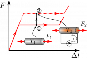 If we were to increase the temperature of an SMA that has been deformed to enter the pseudoelastic regime, without varying its deformation, we would observe that the load required to sustain it increases. This heating could be done, for example, by Joule effect, by passing an electric current through it. This is schematically shown in the following figure, where the load moves from point (1) to point (2):