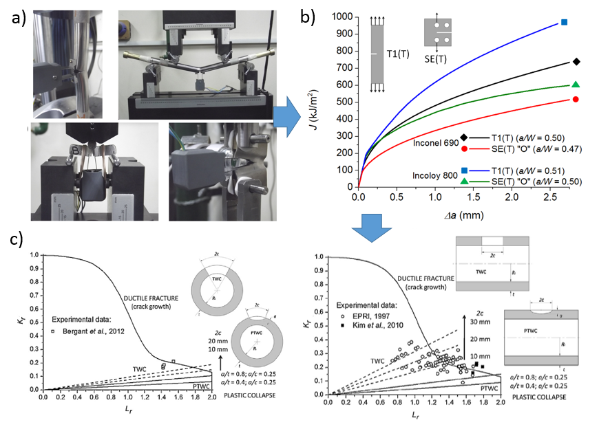In Figure 1a), fracture toughness tests on nuclear steam generator tubes are observed, carried out on one of the servo-hydraulic machines available in the mechanical properties laboratory. Due to the reduced dimensions of the tubes, this study required the development of innovative methodologies, specimens, and experimental techniques [1-4]. The results obtained were applied to analyses of circumferential and longitudinal cracks in operational tubes, Figures 1b) and 1c) [5-7].