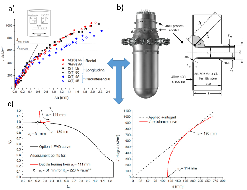 Another line of work is related to the characterization of fracture toughness of ferritic steel SA-508, Figure 2a), which is being used in the construction of the pressure vessel of the CAREM-25 reactor, Figure 2b). The obtained curves are applied in analyses of cracks in process penetrations and dissimilar welds of the pressure vessel, Figure 2b), using different methodologies of elastoplastic fracture mechanics, Figure 2c) [8].